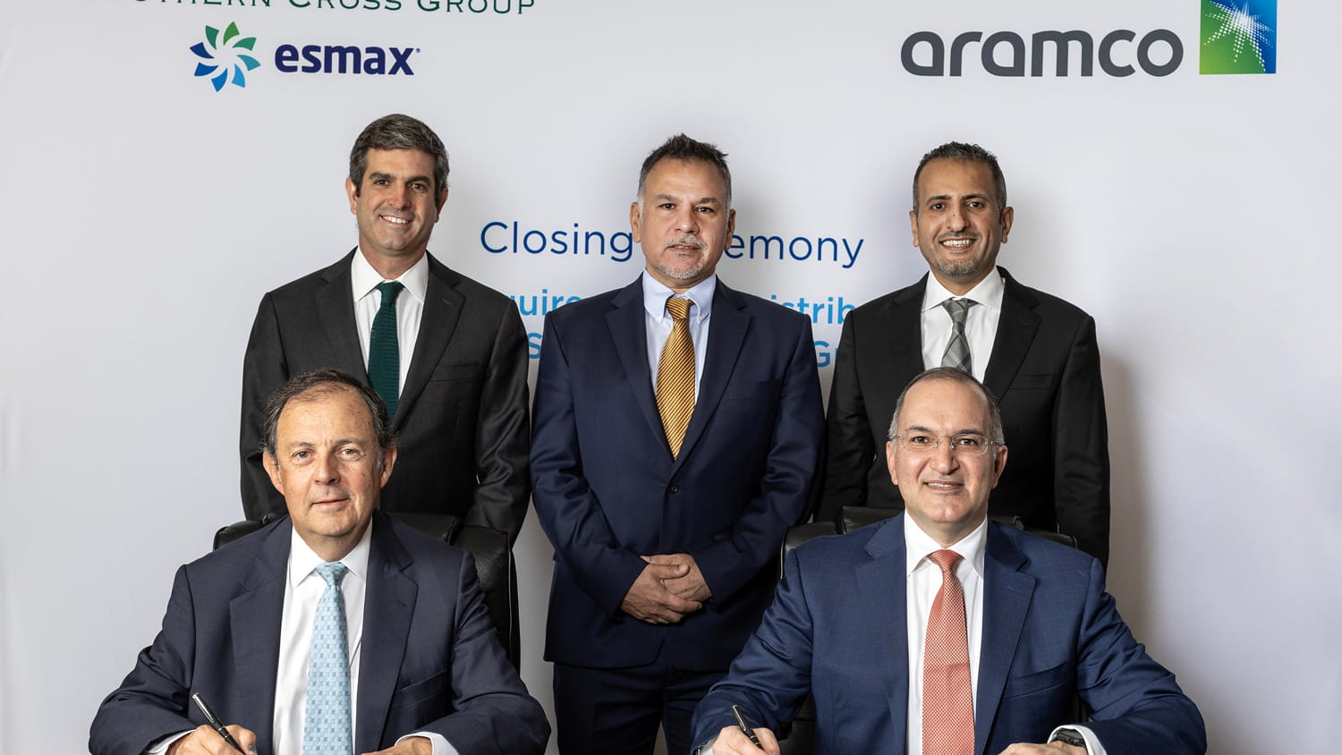 Pictured at the transaction closing are Southern Cross Group Partner Raul Sotomayor, front left, and Aramco Europe President & CEO Mazin Dabbagh, front right. Back row, from left, are Southern Cross Group Partner Jaime Besa, Aramco Vice-President of Retail and Esmax Chairman Ziyad Juraifani, and Aramco International Retail Director Nader Al Douhan.